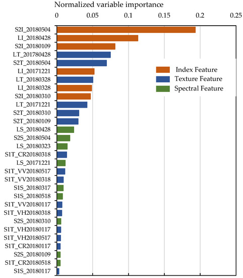 The RF classifier also ranked the features according to their importance, which could provide some useful information to improve the classification process. Figure 8 shows the variable importance of features derived from S1, S2, and L data. The index features were shown to be dominant in the classification result. Meanwhile, Figure 9 shows that the index features derived from S2 and L data separately played more important roles than the other features. Figure 9 shows that in May, the indices in S2 dominated the classification results. The crops grown in the late season had a more important effect on crop classification.