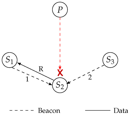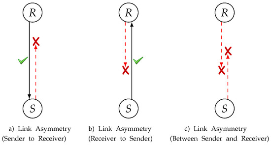Wireless Sensor Networks (WSNs) are one of the most promising technologies in decades. WSNs are frequently utilized in applications such as medical, autonomous vehicles, networking, smart homes, environmental areas and other emergency applications [1,2,3,4,5,6,7,8]. They are composed of huge quantities of sensor nodes capable of sensing, communication, processing, and storage [9,10]. Transferring sensing data between these nodes faces several challenges due to the node’s constraints, e.g., energy limitation [11], low computational capability, and low memory. Without the proper solution to these challenges, the current situation of WSNs cannot meet the requirements of Internet of Things (IoT) [12]. Since these nodes operate with little battery power, an important focus in research is making the sensor nodes live as long as possible. The majority of works, however, assume the link connecting two nodes to be fully symmetric. Asymmetric links, however, create possibilities where the same data is resent, wasting valuable energy. Link asymmetry is considered to be one of the most important characteristics of radio links, which can significantly affect the medium access layer’s performance. In low power WSNs, many of the wireless links are asymmetric [13]. Figure 1 gives scenarios where the links can be asymmetric. Figure 1a shows the scenario in which the sender is able to send data but the receiver cannot. In Figure 1b, the receiver is able to send the beacon and the sender cannot. Finally, in Figure 1c, neither side is able to send data and control information. In this research work, we consider a mixture of above three types whenever any link asymmetry occurs.