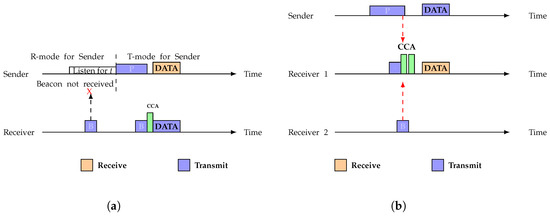 ASYM-MAC [30] works over RI-MAC considering duty cycling. ASYM-MAC combines sender and receiver initiated MAC protocol. By default, system operates on receiver initiated mode. When sender cannot get beacon from its receiver, it waits for `t’ time and then switches to sender initiated mode where it sends its data followed by a long preamble. However, when sender gets beacon from receiver but sender cannot send data due to link asymmetry, this protocol works very poorly. Figure 2a,b shows the working mechanism of ASYM-MAC. ASYM-MAC has two modes of operation: R-mode and T-mode. R-mode is the default mode in which a receiver-initiated MAC is used. ASYM-MAC switches its mode to T-mode when it fails to receive a probing packet from the intended receiver. This switching is triggered by a timeout that occurs after a certain period of time elapses without receiving the probing packet. In T-mode, the transmitter sends a series of small preamble packets to notify the receiver of the pending data transmission. Once the receiver captures the signal of on-going transmission of preamble packets, it also receives data from the sender.