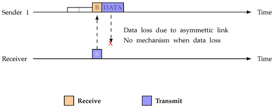 Since link asymmetry can happen at either end, an asymmetric link can be found where Sender 1 tries to transmit data to the receiver. ASYM-MAC does not have a method stating how the sender can transmit in this situation. Figure 4 describes the problem in the data loss situation. Our protocol considers that the link asymmetry can happen at any end. Thus, our protocol can handle the data loss situation.