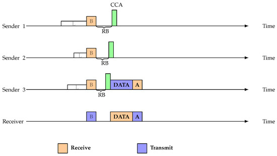 Upon waking up, the parent node transmits beacons to each of its children. The child, which is waiting to send data, pauses for a random short backoff and performs a Clear Channel Assessment (CCA). If the CCA finds that the channel is available, the child will transmit the data. If the CCA finds that the channel is unavailable, the child will wait for the parent to send a new beacon. In Figure 5, each of the three children are trying to transmit data and are listening to the channel. The receiver transmits the beacon when it wakes up. Once the children receive the beacon, they each backoff for a random time to prevent collisions. Sender 3 chooses the lowest backoff time and wins control of the channel. It sends its data and stands by for an acknowledgement from the receiver.