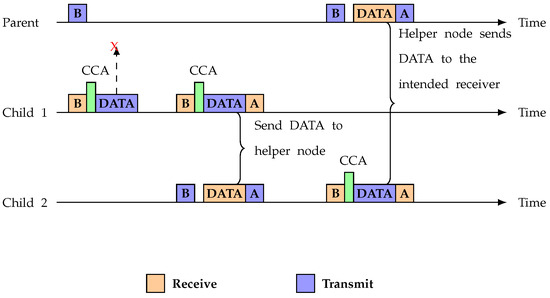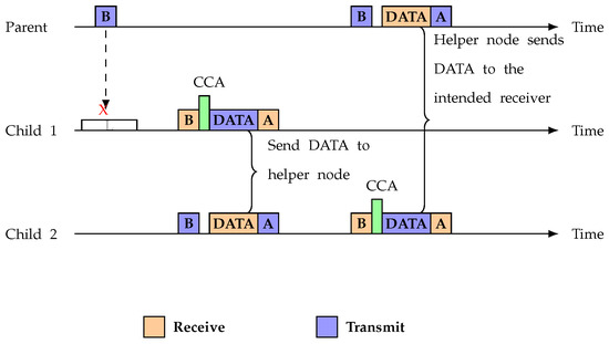 If a child (u) is ready to send data, it will hold until the parent () sends it the beacon. The sender will wait for t time, where t is chosen to be double a node’s wakeup time. If the child is unable to receive the beacon from its parent because of link asymmetry in under t time, the child will use a cooperative node for data forwarding. The cooperative node may be the sibling of the child node or any other neighbor node with equal or lower hop count than the child node. In dense networks, keeping all neighbor node information is very difficult because of memory constraints. Thus, in this paper, we do not use the neighbor table. We only include parent ids and hop counts in the beacon message. By using the beacon information, the child node can make the decision of data forwarding. Now, after exceeding t time, the child u waits for the beacon of its sibling. The sibling that has a comparatively high CSI, high RE, and low distance from parent first sends the beacon as per Equation (4). After getting the beacon child u immediately sends the data. Other children of the parent take the Short Random Backoff (SRB) and when it checks the channel it finds the ongoing transmission, as described in Algorithm 5. In the tree topology, any parent can receive messages other than its child. When children send data packets to siblings, they add parent IDs to the data packets.