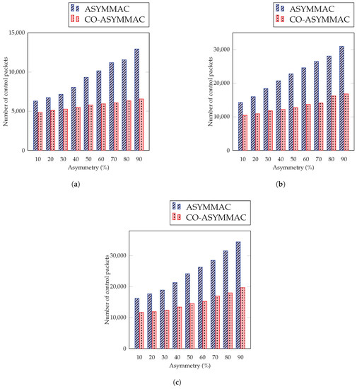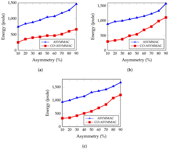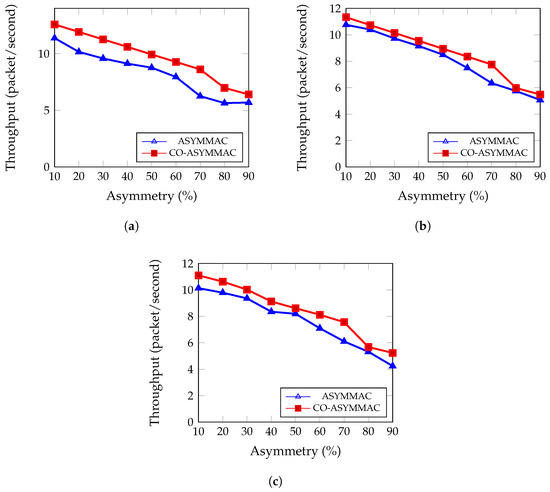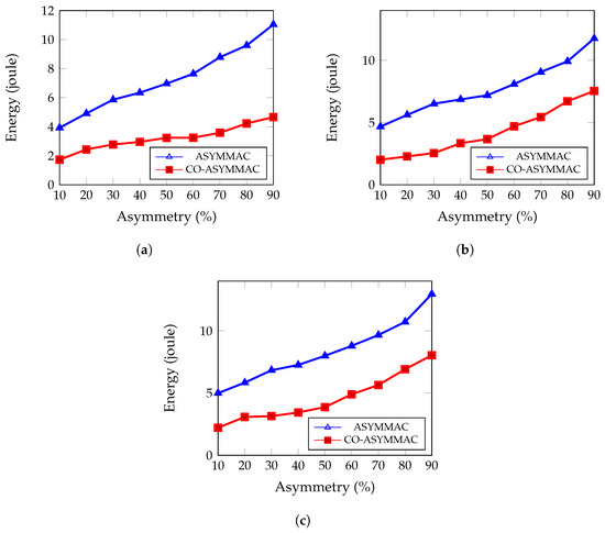 Figure 10 shows that, with the increase of link asymmetry, energy per packet is also increased. COASYM-MAC can effectively reduce this increase in energy consumption. In the case of 50% link asymmetry, it can reduce the energy consumption per packet by 54% for 27 nodes (Figure 10a), by 49% for 54 nodes (Figure 10b), and by 51% for 90 nodes (Figure 10c) as compared to the ASYM-MAC protocol.