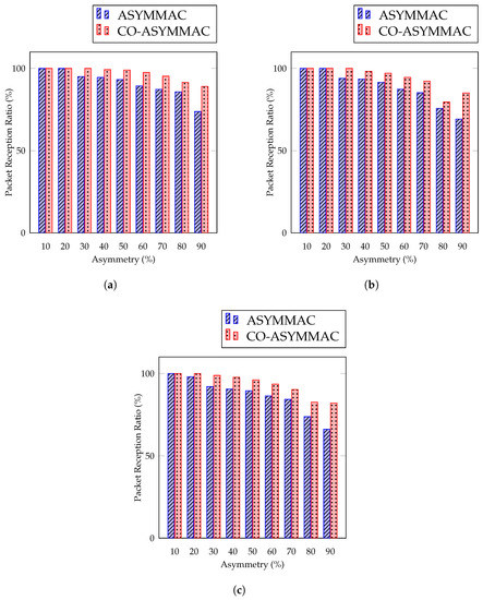 It was also observed that, if the link asymmetry occurs from sender to receiver, then the PRRs of both protocols remain approximately the same; however, if the link asymmetry occurs from either receiver to sender or on both ends, then COASYM-MAC’s PRR is far better than ASYM-MAC. The PRR was also compared with the existing ASYM-MAC protocol with varying asymmetric nodes. The PRR of COASYM-MAC is better than ASYM-MAC because, in ASYM-MAC, the receiver cannot receive data in the case of link asymmetry. On the other hand, COASYM-MAC overcomes this problem by using a cooperative communication technique. The sender waits t time and then sends a long preamble. After getting the receiver’s attention, it sends the data to the receiver. In this long time period, the receiver receives few packets compared to packets transmitted. The data reception rate decreases with the increase of asymmetric percentages. This is true for ASYM-MAC as well as COASYM-MAC, but, in the case of link asymmetry for COASYM-MAC, where the sender cannot transmit data to the receiver, it waits t time and sends data using cooperative nodes. In the case of 90% of link asymmetry, COASYM-MAC performs better than the ASYM-MAC in terms of PRR as it achieves 17% improvement for 27 nodes (Figure 11a), 19% for 54 nodes (Figure 11b), and 20% for 90 nodes (Figure 11c).
