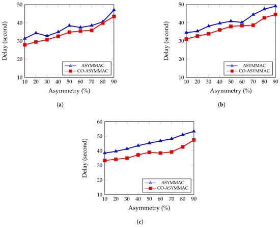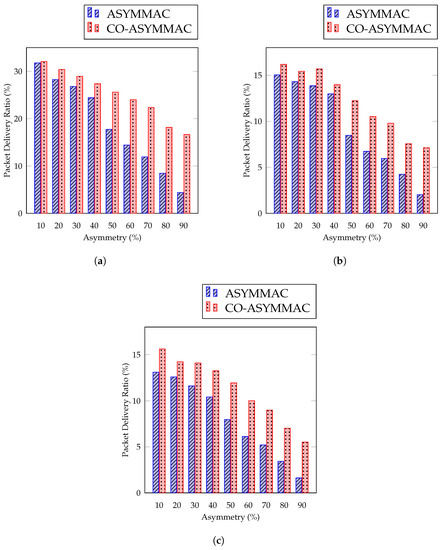 PDR over link asymmetry is illustrated in Figure 12. The proposed protocol improves the packet delivery ratio by approximately 10% considering asymmetric percentage from 10% to 90%. The PDR of COASYM-MAC is higher than ASYM-MAC because, in ASYM-MAC, the sender cannot send data to the receiver; it waits t time and then sends the long preamble in the case of link asymmetry. In that duration, the new packets are generated to the sender; this increases the generated packets rather than transmitted packets and decreases the PDR. On the other hand, in COASYM-MAC, if the sender cannot transmit data to the receiver, it waits t time and sends data using cooperative nodes. If the sender cannot get the beacon from its siblings, it waits another t time for a neighbor’s beacon. If it gets the beacon from a neighbor, it immediately makes this neighbor a parent and solves link asymmetry permanently. As a result, PDR is increased in COASYM-MAC over ASYM-MAC. The percentage of gain in packet delivery ratio for COASYM-MAC is 74.2%, 71.4%, and 70.47% for 27 nodes (Figure 12a), 54 nodes (Figure 12b), and 90 nodes (Figure 12c), respectively, as compared to the ASYM-MAC protocol when link asymmetry is 90%.