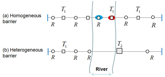 The homogeneous and heterogeneous BR barrier coverage scenario across the same river. (a) Homogeneous BR barrier deployment using three T1 transmitters and five receivers. (b) Heterogeneous BR barrier deployment using T1, T2 transmitters and four receivers.