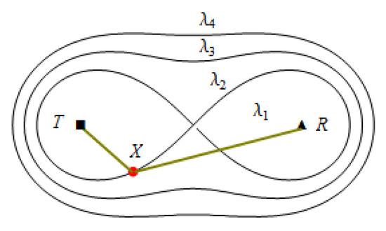 In the BR sensor model, the transmitter and sensor can be placed in different positions. Let denote transmitter , denote receiver , denote the line segment between transmitter and target X, and denote the Euclidean distance of the line segment , denote the line segment between receiver and target X, denote the Euclidean distance between target X and the receiver .