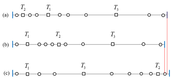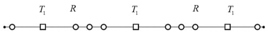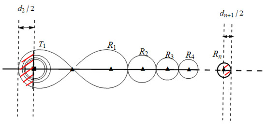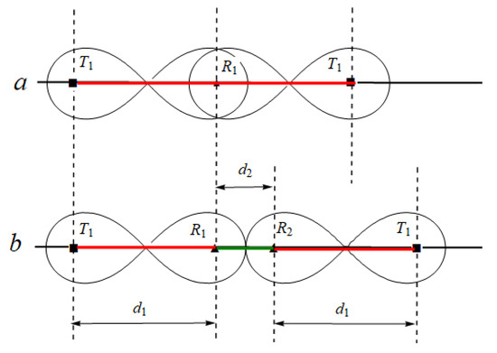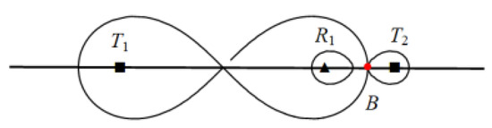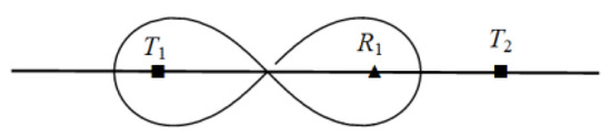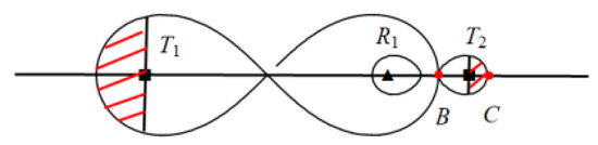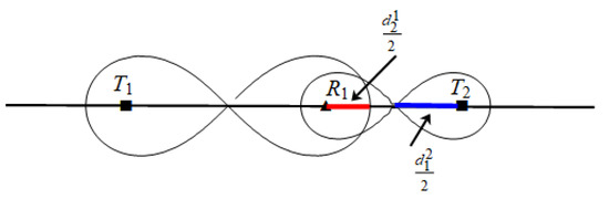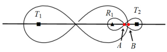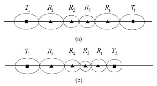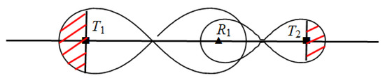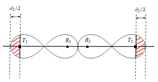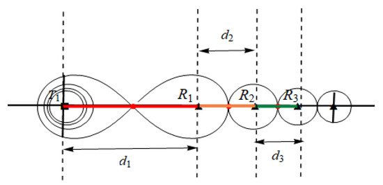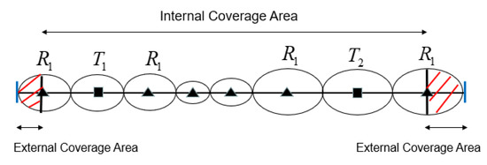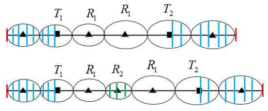 In Figure A6, we deploy two receivers. We can find that continuously increasing the number of receivers between two transmitters which has the same properties will not affect the length of coverage area in shadow area, as shown in Figure 10. At the same time, we found that the coverage area of has axis symmetry, so the length of its left and right shadow external coverage areas is equal. We can get the length of the shadow external coverage area of placement sequence is . □