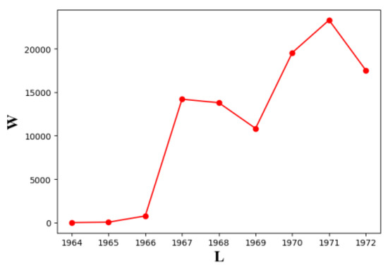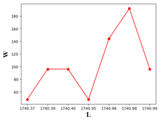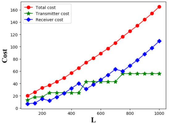 Then, we consider the experiment of line barrier coverage with the minimum coverage cost. In this experiment, we set the length L of the line barrier from 100 to 1000 with a step of 50, and the six types of transmitter is , the value of K is , respectively. One for each kind of transmitters, while there is no limit to the number of receivers. The unit price of the transmitter is and the unit price of receiver is 1. The following experimental results are calculated by using Algorithm 3, as shown in Figure 24.