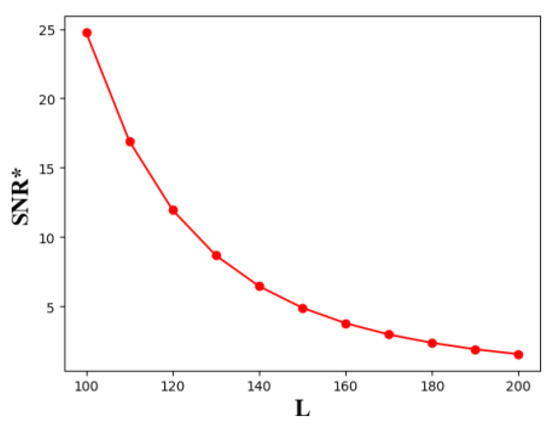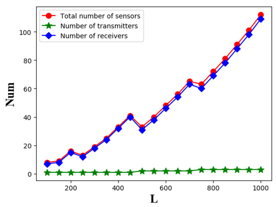 In the simulation experiments, we set the length L of the line barrier from 100 to 200 with a step of 10, and the six types of transmitter is , the value of K is , respectively. The number of transmitters for each class is , 20 in total, while the number of receivers is 100.