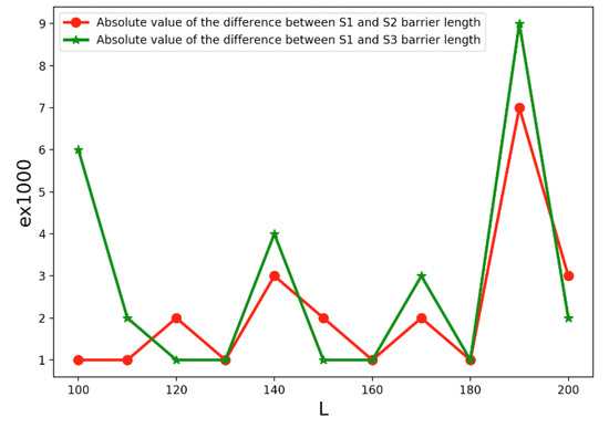 We calculate the absolute value of variation deviation of S1, S2, and S3 barrier length, separately. As shown in Figure 23, the absolute value of the difference is between and .