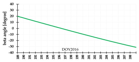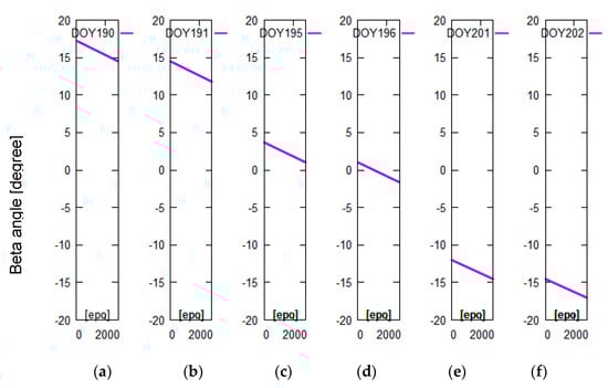 The yaw angle is mainly controlled by the beta angle of the satellite. To better analyze the correlation between beta angles and differences in PCO correction, we selected related data which the beta angles encompass the threshold of attitude transition. Considering the limitation of length of the paper, we presented the analysis results related to 20 days of data: days of year (DOY) 189-208 in 2016. The related beta angles were calculated and linearly vary from in Figure 2. The tests didn’t selected one beta cycle of data because the transition threshold of the combined attitude has characteristics with short-term change with time, which is better for getting the transition threshold and POD. Figure 3a–f shows that the Jason-3 beta angles are nearly the transition threshold ( are obtained from test analysis in this section) of the combined attitude in DOY190-191 (Figure 3a,b), DOY195-196 (Figure 3c,d) and DOY201-202 (Figure 3e,f). In Figure 4, Figure 5 and Figure 6, the units of the x-axis are epoch of day.