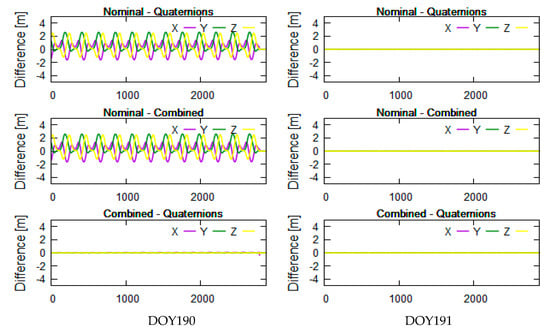 The left and right sides of Figure 4, Figure 5 and Figure 6 reflect the differences in receiver PCO correction in the inertial system using different attitude modes in DOY190-191, DOY195-196, and DOY201-202, respectively. From top to bottom are the differences in PCO correction between nominal attitude and quaternions, between nominal and combined attitude, and between combined attitude and quaternions.