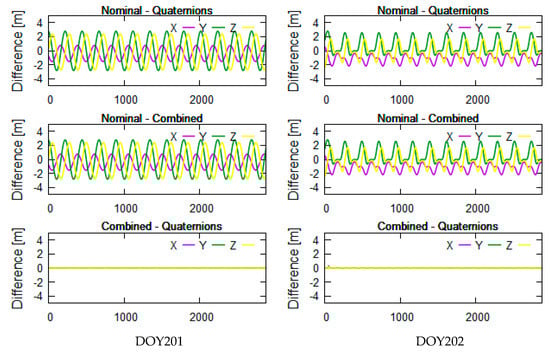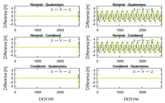 The Jason-3 beta angles are nearly in DOY190-191, nearly 1.06 in DOY195-196 and nearly in DOY201-202 (see Figure 3). In Figure 4, Figure 5 and Figure 6, the differences in PCO correction between nominal attitude and other attitude modes reached a maximum of in DOY190, DOY196 and DOY201-202. In DOY191 and DOY195, the differences between three attitude modes are almost 0, which indicates that three attitude modes are available in these cases. In DOY190-191, DOY196, DOY201-202, the results using combined attitude are almost consistent with quaternions; it shows that the combined attitude and quaternions can be employed in PCO correction. At the end of DOY195, some abnormal values are shown in Figure 5; we searched for the attitude event information and discovered a process about yaw flip of 10 min at 21 o’clock on that day. And all attitude models have the modeling error that caused the poor results.