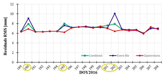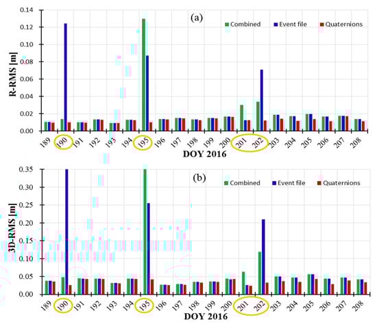 To compare the differences between the combined attitude, event file and quaternions, we also perform the tests on POD. The residuals RMS with different attitude modes are showed in Figure 7. Figure 8a,b denotes the accuracy comparisons in radial (R) directions and 3D position between our orbits and the CNES orbits. In Figure 7 and Figure 8, we marked the obvious differences with orange cycles on DOY190, DOY195, and DOY201-202. Here, noted that the attitude transition node between yaw-steering and nominal modes are in DOY190, DOY201-202; the attitude node of yaw flip are in DOY195, so on these days, the RMS variations of residuals, R direction and 3D position with the combined attitude and event file are larger than other days due to modeling errors.