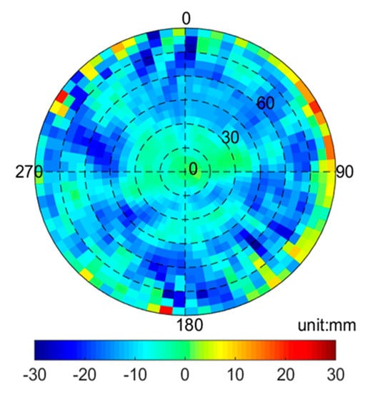 The receiver PCVs of the Jason-3 satellite were modeled with the residual method. Since partial PCVs may be absorbed by receiver clock error, ambiguity and other parameters in the POD, iterative procedures are required to continuously correct PCVs, which means that the new results as increments are generated to add them to the last PCVs grid model with the same resolution in the form of 5° × 5° grids. This procedure was repeated several times to obtain a final receiver PCVs grid model of the Jason-3 satellite from ionosphere-free combinations. Considering the complex satellite attitude, we selected nine-month data to better model PCVs from April to December in 2016, including more than two full beta cycles of data. Figure 9 shows the receiver PCVs map of Jason-3 derived from ionosphere-free combination. The comparisons of orbit residuals, external orbits and SLR validation results were performed to reflect its impact on Jason-3 POD.