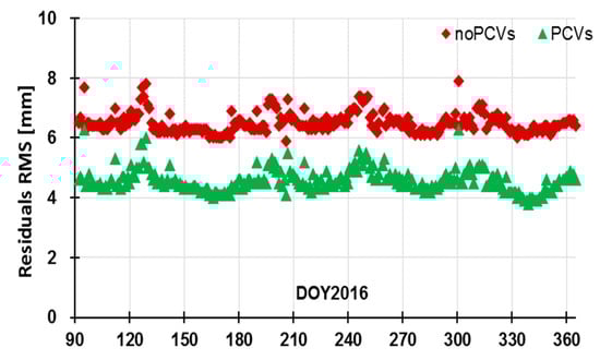 In Figure 10, the residuals RMS of Jason-3 POD with and without PCVs map are approximately 4–6 and 6–8 mm, respectively. The mean residuals RMS with PCVs map are reduced from 6.5 to 4.6 mm; the internal accuracy is improved by 1.9 mm. These results are consistent with the noise level of the ionosphere-free combination of the carrier phase, which indicates that models and methods are reasonable for Jason-3 satellite.