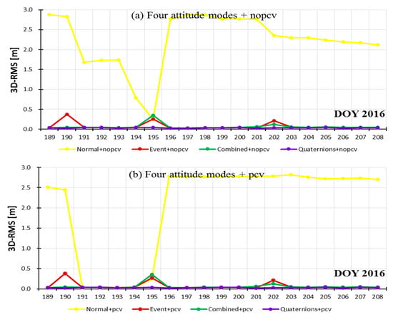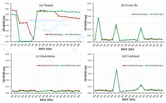 Figure 11 and Figure 12 show the stability of orbit accuracy (3D-RMS) based on the eight schemes according to with/no PCVs and different attitude modes, respectively. The stability of orbital R-RMS based on eight schemes is similar to those of 3D-RMS; so it will not be shown here. From Figure 11 and Figure 12, we noted that the introduction of PCVs has little influence on the stability of orbit accuracy. Note that Figure 12b–d have the same range of ordinates, which are different from Figure 12a. Among four attitude modes, the stability of orbit accuracy based on quaternions is the best in Figure 12c; the stability of combined attitude is better than that of event file in Figure 12b,d; the normal attitude has the worst results in Figure 12a. The integrated stability of different attitude modes and receiver PCVs on POD are almost consistent with the effects of a single variable.