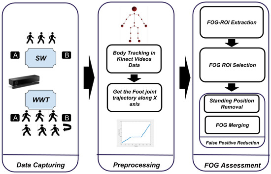 In this paper, an automatic FOG assessment system is proposed for helping specialists with automatic assessment of FOG for PD patients and provide efficient and on time treatment. The general framework of the proposed system is shown in Figure 1. It has three phases, including data capture by Kinect, data preprocessing, and FOG assessment. All the steps of the Kin-FOG system are explained in the next subsections.