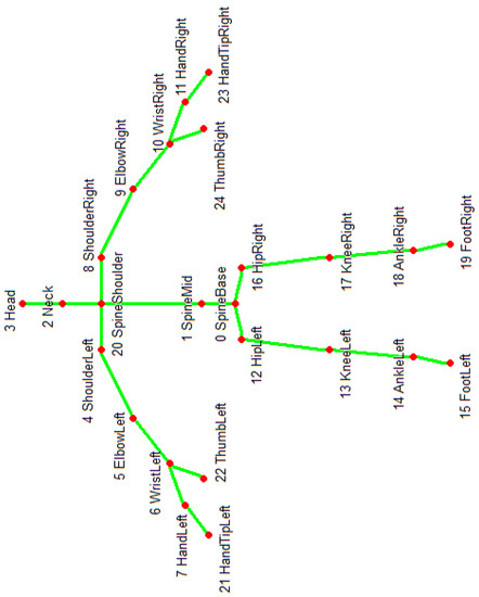The Microsoft Kinect V2 is a non-wearable sensor for capturing the 3D motion of a person. It was invented for Xbox console game devices which allow interactions with body movements, voice, and images. It has three main parts consisting of a 3D depth sensor, an RGB camera and multi-array microphones which are shown in Figure 2. Kinect V2 is cheap compared to other video capture devices and other motion capture sensors. It employs an RGB camera with a resolution of 1920 × 1080 at 25 fps and a depth sensor with an output resolution of 512 × 424 based on time of flight. The depth range is 0.5 to 4.5 m. Kinect V2 can detect up to 6 people, with each person represented by 25 joints. Figure 3 illustrates these joints of the body.