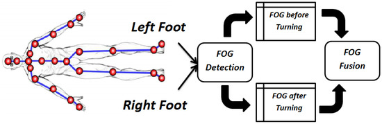 The SW experiment FOG assessment just needs the left foot X trajectory. However, the WWT experiment needs both left and right feet X trajectories to detect all the FOGs. In the WWT experiment the trajectory signal has two parts consisting of before turning and after turning. The left foot trajectory is used before turning and the right foot trajectory follows the same procedure for after turning. At the end, the analysis results of the left and right feet are fused to get the final FOG assessment for the WWT experiment. Figure 6 illustrates the process for the WWT experiment.