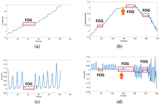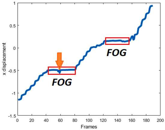 where g(x) shows the derivative of the trajectory signal. The gradient computed by finding the distance between the displacement value of frame i, f(xi) and the displacement value of the previous frame f(xi−1). Also, n is the total number of frames. We find all the areas with derivative close to zero based on Equation (2). These regions are the candidates of FOG.