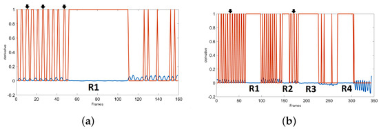 The derivative plot in blue with the h(x) plot in red. Some samples of non-FOG regions with zero derivative are shown with an arrow. R1, R2, R3, and R4 are the real FOG regions. (a) SW with 1 FOG, (b) WWT with 4 FOGS.