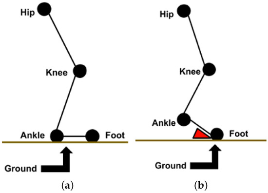 The leg joints, and hip, knee, ankle, and foot positions, are presented in Figure 9 in FOG and standing mode. Once subjects have FOG the angle between the ankle and foot joints and the ground will be changing; but when they are in the standing mode this angle is stable. Furthermore, the corresponding angle between the foot and ground is shown in Figure 9 with the red triangle. Observe that the angle is almost zero for the standing mode, but it changes in the FOG state. This angle is called αAG for simplicity.