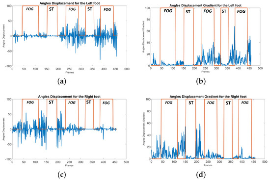 After computing αAG for all the frames, the detected FOG episodes from the previous step are assessed in this angle data to remove the standing mode areas. The displacement of the angle list (AFG − list) is taken to find out the amount of angle change over time for the current subject. The displacement can be computed by Equation (4).