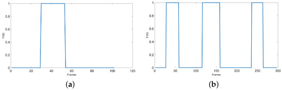 The number of FOGs and their lengths will be computed as well. The number of FOGs is the number of peaks in the FOG plot and the length of FOGs is computed based on Equation (5) for the final detected FOG-ROIs. FOGLenfr is the length of that particular FOG with the start frame ID (strFID) and stop frame ID (stoFID).