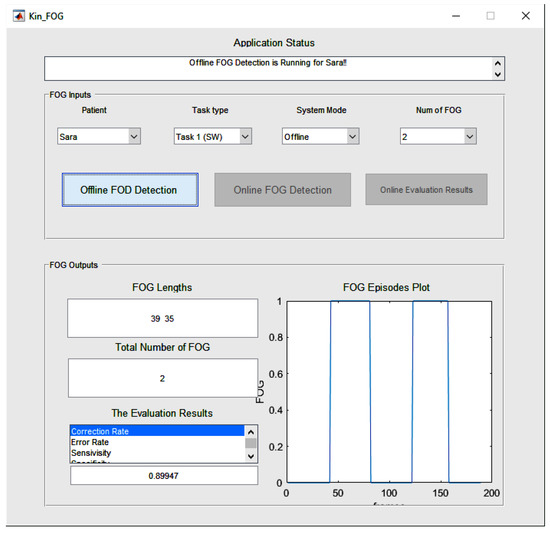 Video data is collected for each subject in WOST for different numbers of FOGs. As mentioned before for SW, the subjects perform 1 and 2 FOGs and for WWT, 3, 4, and 5 FOGs. The FOG episodes happen randomly for each subject. The reason behind performing different numbers of FOGs in each experiment is having a more reliable and general system which works in different situations. The graphical user interface (GUI) is designed for our proposed Kin-FOG system, as shown in Figure 15. The proposed system has two modes including: (1) Offline FOG assessment, (2) Online FOG assessment, which both give useful FOG information on PD patients to the neurologists and care providers. The offline part gives all the required FOG information for the entire data captured by Kinect for the subjects. However, the online part is for visualization of the FOG status for each frame separately. The main GUI has two sections which are ’FOG Inputs’ (the inputs of the system) and ’FOG Output’ (the outputs of the system). The ’FOG Inputs’ part has options for choosing the patient, the task type (SW, WWT), the system’s mode (offline, online) and the number of FOGs (for SW:[1,2] and for WWT:[3,4,5]). The Num of FOG parameter is for evaluation purpose since we need to get the right ground truth labels based on the selected criteria.