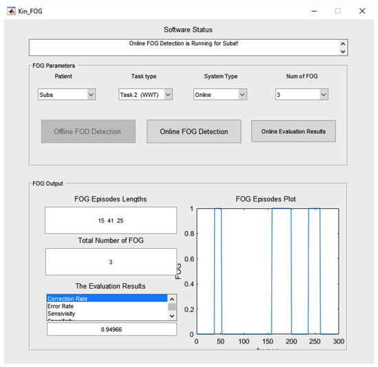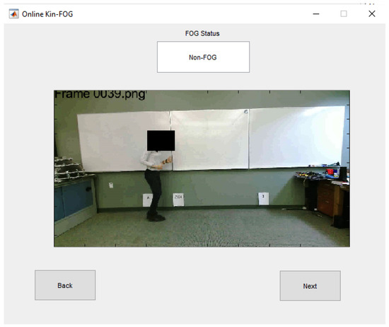 The online mode of the system has a separate GUI which is presented in Figure 16. The main GUI gets all the required information from the FOG Inputs part and shows the corresponding video frames for the particular subject in the online GUI. The online Kin-FOG presents the FOG status for each frame to the users (specialists or care providers) as shown in Figure 16.