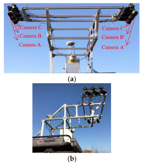 (2) System construction and installation: A camera mount that extends from the rear of the vehicle is designed for the high-resolution ground image acquisition. The cameras are also tilted 20° toward the rear of the vehicle to increase the shooting range, as shown in Figure 2a,b. The Sony A7 manual states that the camera has a shooting speed of 1 image/s at the highest resolution, but the exposure interval is longer than one second during acquisition to prevent image loss. Furthermore, an image acquisition rate of 1 image/s requires a vehicle speed of 18 km/h, which seriously affects local traffic and the efficiency of our work. A sequential exposure method that uses multiple cameras in a symmetrical arrangement is therefore proposed. Three pairs of cameras (labeled A, B, and C in Figure 2a) are employed to acquire ground images sequentially, and they are positioned based on the load-bearing capability of the mounting frame, system stability, operation efficiency, image accuracy, and image overlap. The modified system is shown in Figure 2. The camera exposure is based on the mileage value, with the exposure signal triggered at a certain distance interval. This setup ensures that the data requirements are met for a vehicle speed of 40 km/h.