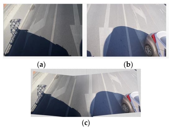 Symmetric exposure from both the left and right also increases the ground shooting range to three traffic lanes, as shown in Figure 3. Figure 3a,b are the ground images taken by the left and right cameras, respectively, and Figure 3c is the fused image, which yields an image that covers three lanes.