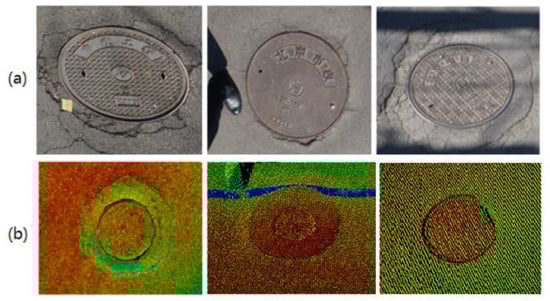 The above modifications are sufficient for the daytime detection, identification, and maintenance of manhole covers. The ownership information extracted from the manhole covers is clear and visible, as shown in Figure 4. Example ground images are shown in Figure 4a, and example LiDAR data from different manhole covers are shown in Figure 4b. The high-precision images and LiDAR data acquired by the improved SSW-D system provide a favorable database for the later detection and maintenance of manhole covers.