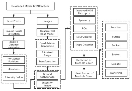 An increasing number of urban manhole covers are being used in road administration (e.g., for electricity and gas supply, fire control, water supply and draining, communication, and sewage discharge) as rapid urban development in the digital age promotes constant growth, city planning improvements, and road construction. The daily management, maintenance, and inspection of these covers now involve increased workloads and difficulties. Frequent and heavy traffic also leads to cover damage and subsidence, which often reduces road and infrastructure safety, thus posing potential dangers to road users [1,2]. The manual detection and repair of defective manhole covers via traditional methods can no longer meet the demands of modern cities in terms of timeliness, safety, and inspection accuracy. The automation of urban manhole-cover management, which acquires accurate location and ownership information—and their inspection and maintenance at higher operational safety levels—is now a primary focus in intelligent road administrations. The recent emergence and rapid advancement of mobile mapping [1,2,3] present effective methods for the monitoring and maintenance of defective manhole covers, while also functioning as data sources. The mobile mapping system is a new-generation multi-platform and multi-band mobile information acquisition system, this system is mounted on a carrier vehicle and integrated with various sensors, such as a laser scanner, inertial navigation system, global navigation and positioning system, and digital camera [4,5,6,7,8,9,10,11,12,13]. It offers a high-precision and high-efficiency means of acquiring large quantities of three-dimensional (3D) point cloud and image data in real-world environments, and has now become an indispensable component in the evolution of digital cities, providing long-term support in promoting the construction and management of modern cities and the transformation to digital management and operation. It also presents new possibilities and methods for the automated location, extraction, and identification of urban manhole covers.