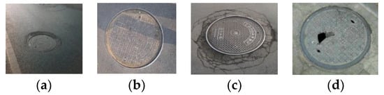 Example manhole cover conditions. (a) Sunken manhole rim. (b) Sunken manhole cover. (c) Damage to the periphery of the manhole. (d) Damaged manhole cover.