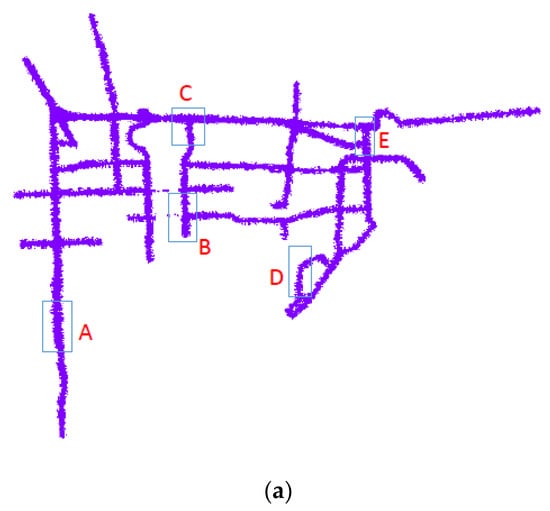 For convenience, we choose an urban road in Beijing, China, with more manhole covers, as the experimental area to verify the effectiveness and feasibility of the proposed method. The vehicle is driven at 40 km/h during the data acquisition, with the entire study area shown in Figure 9a, among, Figure 9b–f is the sample A,B,C,D,E located at the area of Figure 9a. A total of 216.885 km of roads were surveyed, with 1.80 × 105 high-definition ground images and 6016 laser files acquired. The laser files contain 1.36 × 109 laser-scanned points at a point density of 1800 p/m2. The data include various complex ground features, such as vehicles, trees, buildings, and acoustic barriers, to meet road administration requirements, and ensure effective and accurate manhole cover detection. The following experimental analyses are performed on the five road-section samples. The data acquired with the proposed system in this study are used for the automated extraction of manhole covers, and the subsequent detection, identification, and assessment of manhole covers employ the proposed method. This manhole cover experiment confirms the feasibility of the acquisition system and the effectiveness of the method.