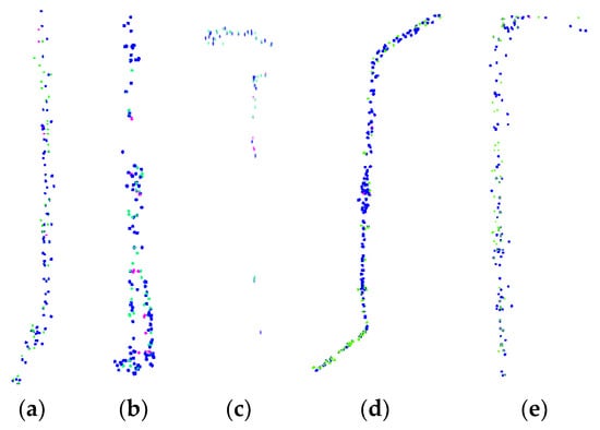 The manhole cover extraction from the images consists of first generating the ground orthophotos from the images, with the manhole cover extraction and detection carried out using the method described in the Section 2.2.3. The high degree of agreement between the laser-scanned point clouds and image data yields overlaps in the extraction results that need to be removed. In total, 7015 positive samples and 8185 negative samples are generated from the ground orthophotos. The robustness of the proposed method is verified by the data from road samples A–E, as shown in Figure 10. The blue points are the extraction results from the point clouds, the green points are the results from the image data, and the magenta points are the undetected covers. Numerous overlaps are present in the extracted structures detected by the two data sources, as seen in Figure 10. However, some manhole covers can only be extracted from the intensity-based images, while others can only be extracted from the ground orthophotos. Improved results are therefore achieved by merging the extraction outcomes of the two data sources and removing the repeated extracted results, as given in Table 3.