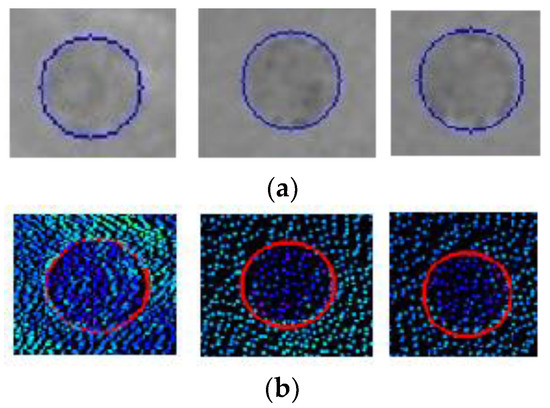 Manhole cover identification includes manhole maintenance and ownership information acquisition, which is achieved based on the extraction results presented in Section 2.2.4. Manhole cover maintenance is determined from the elevation fluctuations of the manhole cover, its rim, and the surrounding areas, which require the manhole cover outline. We can obtain the manhole cover outline via the proposed method, with the extracted outline result computed from the intensity-based images (Figure 11a) and determined by superimposing the computed outlines on the point cloud data (Figure 11b).