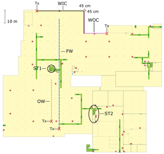 Ground plan of the underground parking garage, showing the different measurement scenarios: dashed blue line: free way (FW), path to and from the parking spots (Figure 2); dash-dotted orange line: obstructed way (OW), path through a line of parked cars (Figure 3); solid black line: along the wall with inside corner (WIC) (Figure 4); dotted purple line: along the wall with outside corner (WOC) (Figure 5); Staircase 1 (ST1, two 90 turns) (Figure 6); and Staircase 2 (ST2, straight) (Figure 7). Transmitter (Tx) locations are marked by red crosses. The green lines with arrows represent evacuation paths for pedestrians in the case of an emergency. It should be noted that these paths are different from the paths that first responders would use, especially in the case of a fire when a path along the walls would be followed.