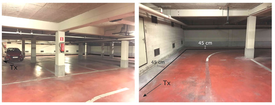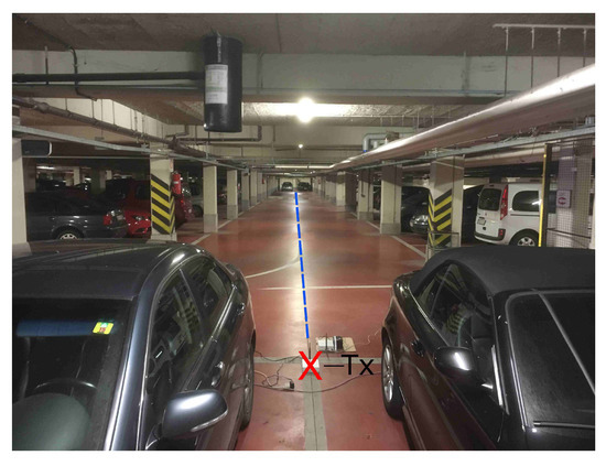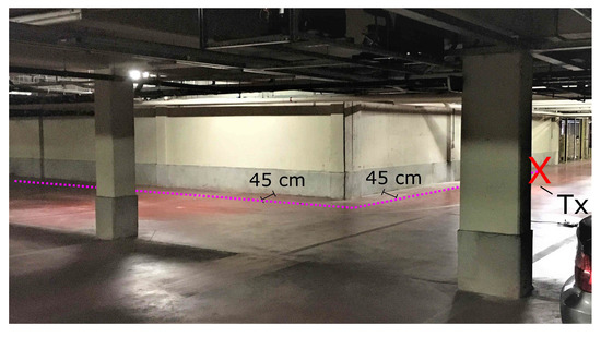 The first scenario offers a continuous LOS path on the road to and from the parking spots. This scenario is marked as FW in Figure 1. No obstacles are present, but some water pipes are attached to the ceiling, which may influence the propagation of the radio waves. Figure 2 provides a more detailed view. A first measurement was executed when the underground parking garage was nearly empty with a rather low spatial resolution (The low resolution is defined as follows: a resolution of 0.3 m for Tx–Rx distances up to 10 m, a resolution of 0.5 m up to 20 m and a resolution of 1.0 m for distances further than 20 m), to increase measurement efficiency. This was repeated for a nearly full underground parking garage. At the low resolution, however, the spacing between points at large Tx–Rx range became too large, and thus averaging to remove the small-scale fading became impossible (see Section 3.1). To mitigate this problem, a third measurement was performed with a higher spatial resolution (The higher resolution measurements have a resolution of 0.05 m throughout), again when the garage was nearly empty.