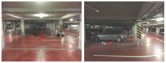 Scenario OW: View from behind the Tx (red X), for the nearly empty underground parking garage (left); and the view to the side of the Tx (red X), at the moment when the garage was nearly full (right). The measurement path is indicated by the dashed orange line.