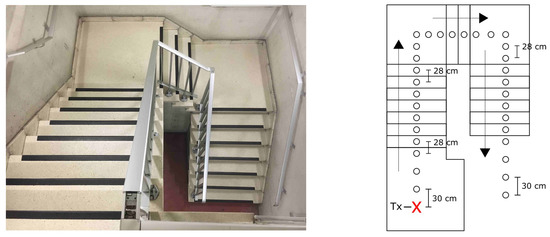 The staircase is a crucial location for an RIT: it serves as an access point, it is used to evacuate people and it is a possible location for an improvised base. The underground parking garage in this research offers two staircases: one with two bends (ST1) and the other completely straight (ST2). Pictures of these staircases together with a graphical representation of the measurement points are given in Figure 6 and Figure 7.