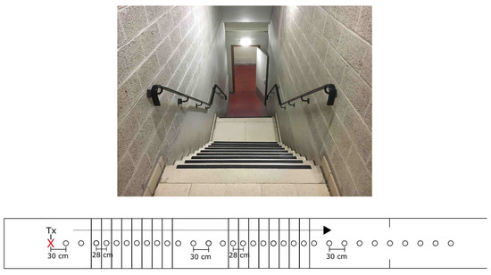 Scenario ST2: Photo of Staircase 2 (top); and graphical representation of the measurement points (bottom).