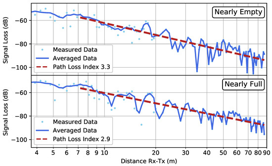 Scenario FW: The low-resolution measured data in the case of a nearly empty parking garage (top) and a nearly full parking garage (bottom). The average computed by Equation (3) is shown by the solid line, whereas the fitted path loss line is indicated by the dashed line.
