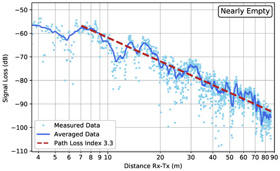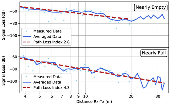 The results of the OW scenario are shown in Figure 10. In this case, the difference in PLIs for the nearly full and nearly empty parking garage was much larger than in the FW scenario. Due to the transmitter and receiver being so close to the ground, the cars blocked the LOS component of the connection, which had a detrimental effect upon the PLI. As expected, the PLI that was found in the case of a nearly empty parking garage was comparable in the OW and FW scenarios. The data at larger distance (from onward) in the nearly empty OW scenario were not taken into account for the PLI fit because of their non-monotonous behavior. This behavior could be caused by the reflecting wall at the end of the measurement line, as shown in Figure 1.