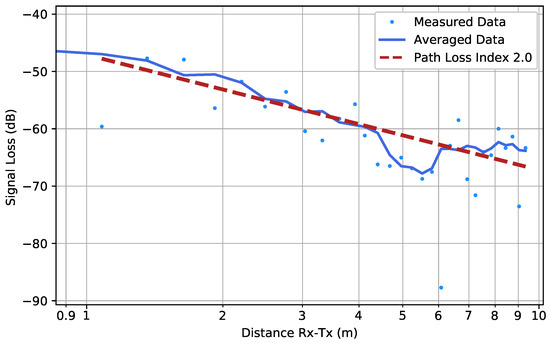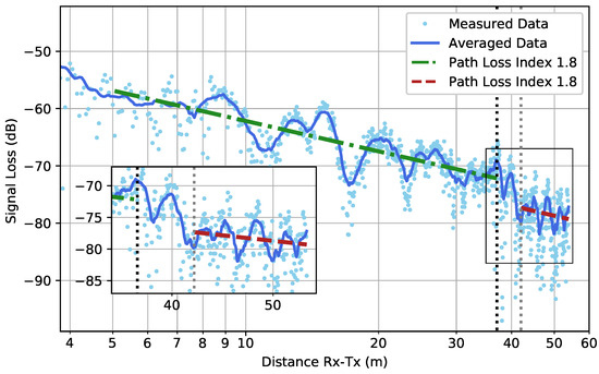 where symbolizes the number of elements (It is important to note that is not the same for every k and its value will change when the measurement resolution changes) in . These two steps were done for every measured point so that the original dataset was transformed into an averaged dataset. Because large-scale fading and path loss were the most relevant channel characteristics for this research, the subsequent analysis was performed on the averaged data only. The reader can find the data in the supplementary files of this paper.