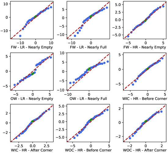 To verify how well the shadowing phenomenon fit a log-normal distribution, in Figure 15, the Q-Q plots of the shadowing fluctuations in the different scenarios are given. The theoretical normal distributions have zero mean and a standard deviation equal to . These results are further analyzed in Section 5.2.