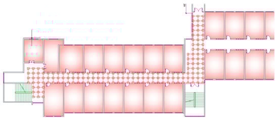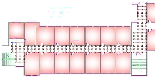Generally speaking, a clustering algorithm can achieve information aggregation by classifying process according to the similarity between sample points. In this paper, the clustering algorithm is used to realize the division of fingerprints and coarse location. Comparing with the clustering algorithm by RSSI, we take the MAC addresses of APs as the clustering index. In order to verify whether the Mac addresses of APs can be used as clustering index, a test was conducted in the experimental area as shown in Figure 7. The process of collecting AP’s signal starts from the westernmost point (the blue point) in the indoor space, and continues from west to east until the easternmost one (the red point). It is worth noting that reference points are numbered from the west to east.